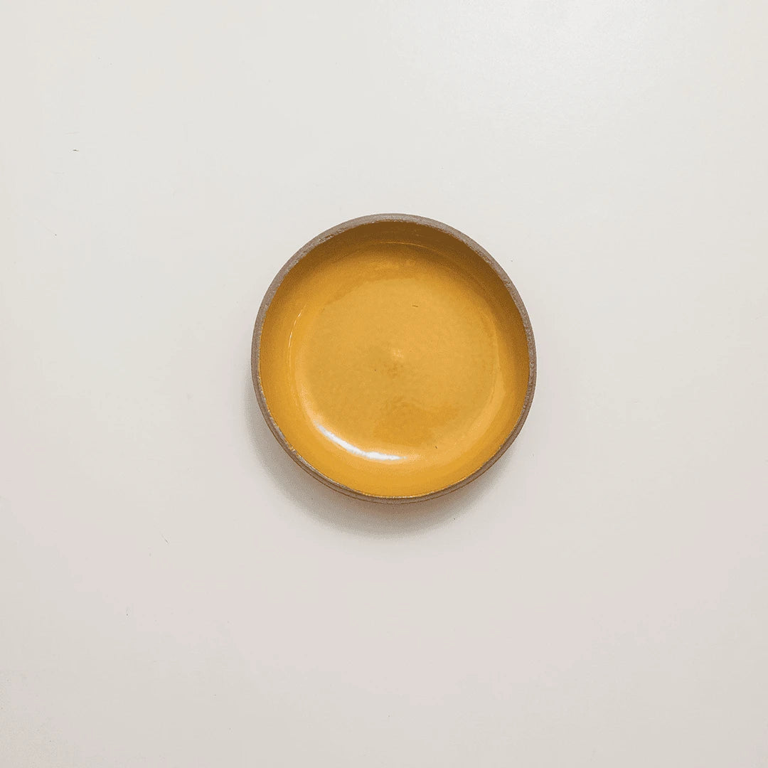 La pièce présente une forme parfaitement arrondie dotée d'un profil profond. Elle se distingue par le contraste audacieux entre sa base texturée associant le grès et le ciment, et son intérieur revêtu d'un émail lumineux. Ce modèle se décline en un trio de couleurs franches et vibrantes : un jaune solaire, un rouge carmin profond et un vert franc.