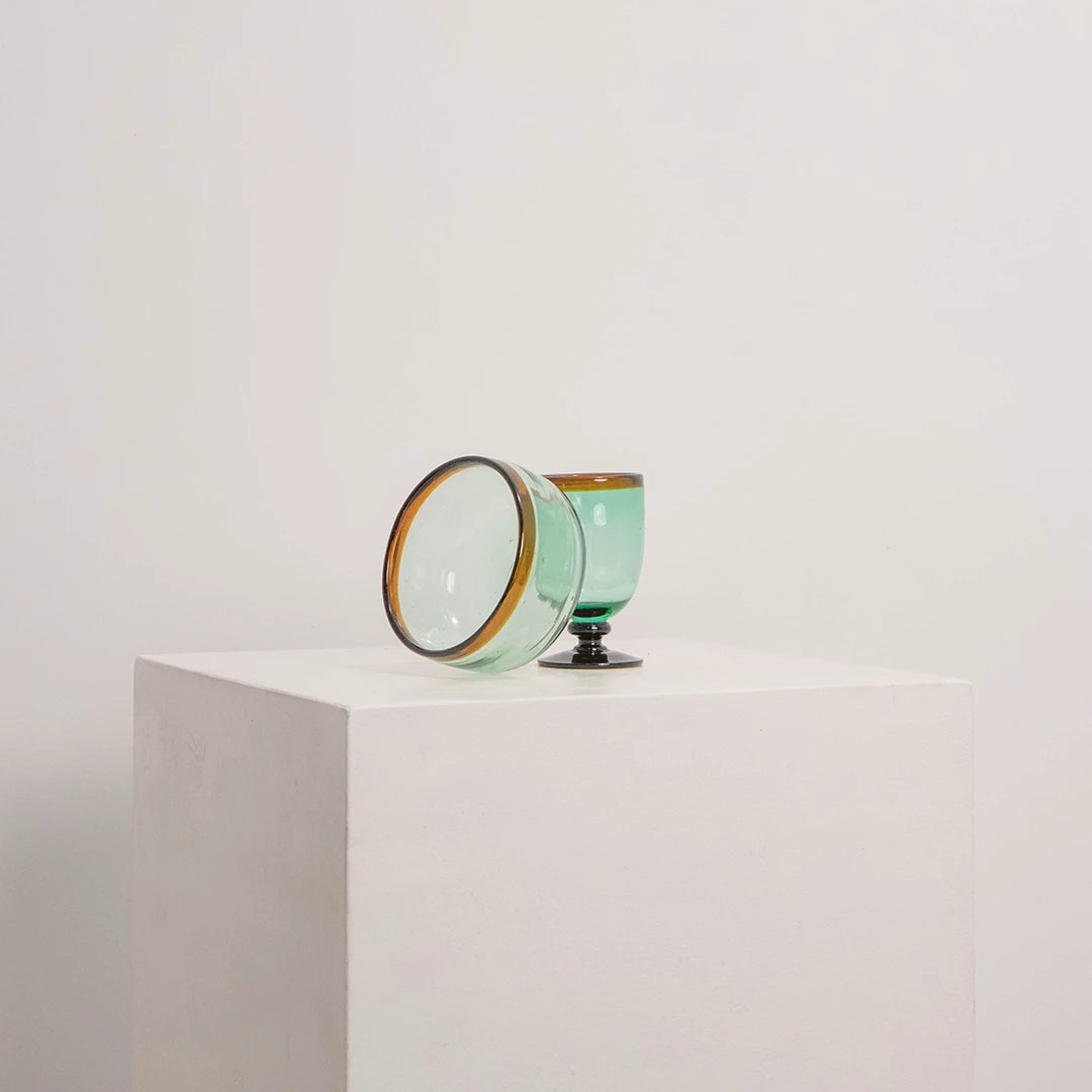 Ce modèle capte immédiatement le regard par sa forme basse et épurée ainsi que son jeu de teintes d'une rare délicatesse. La coupe dévoile un verre translucide aux doux reflets bleu-vert, subtilement soulignée par un liseré aux chaleureux reflets ambrés. La nature entièrement manuelle de sa conception offre de subtiles variations de lignes et de proportions, élevant chaque contenant au rang de pièce singulière et incomparable.
