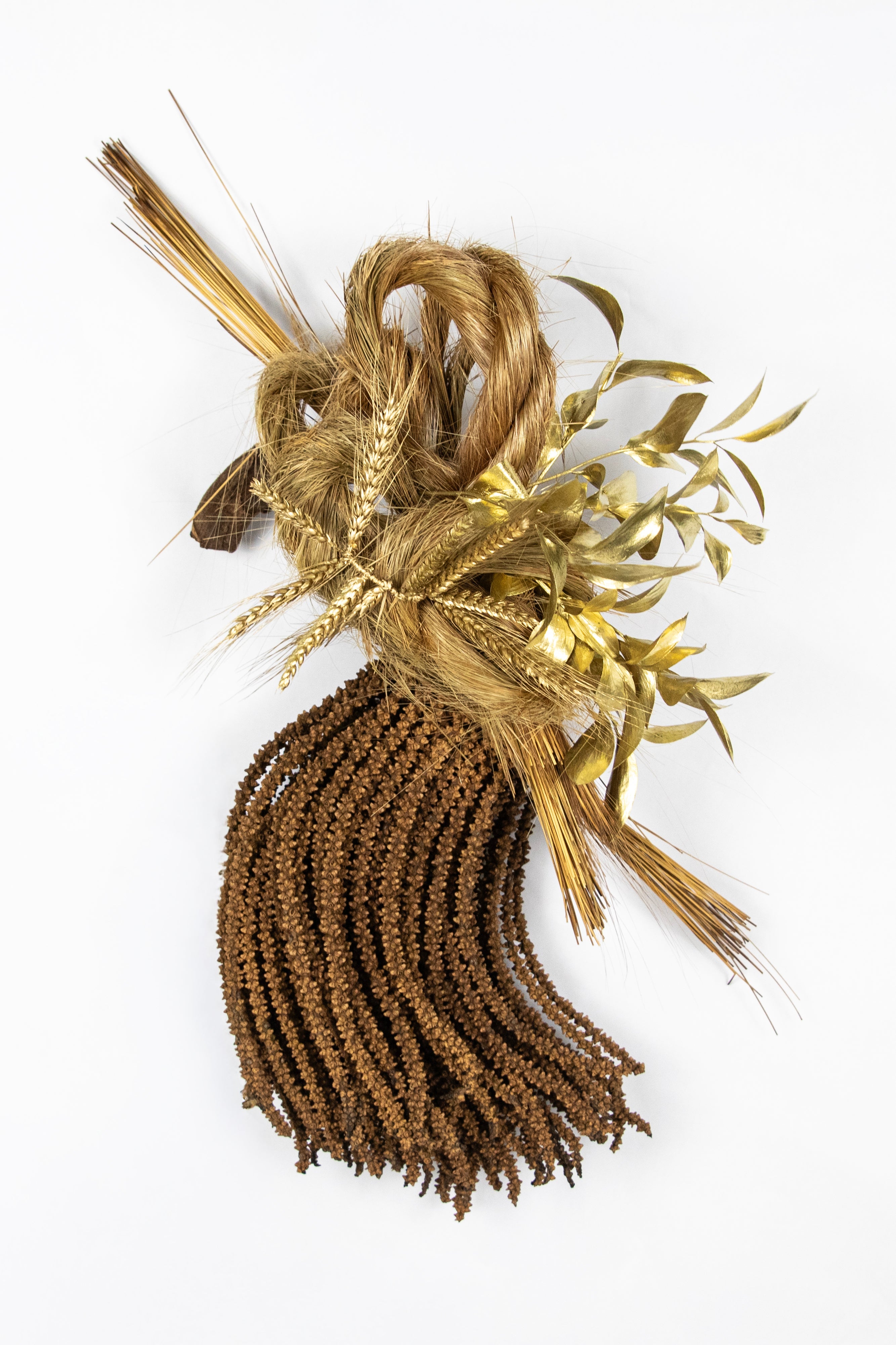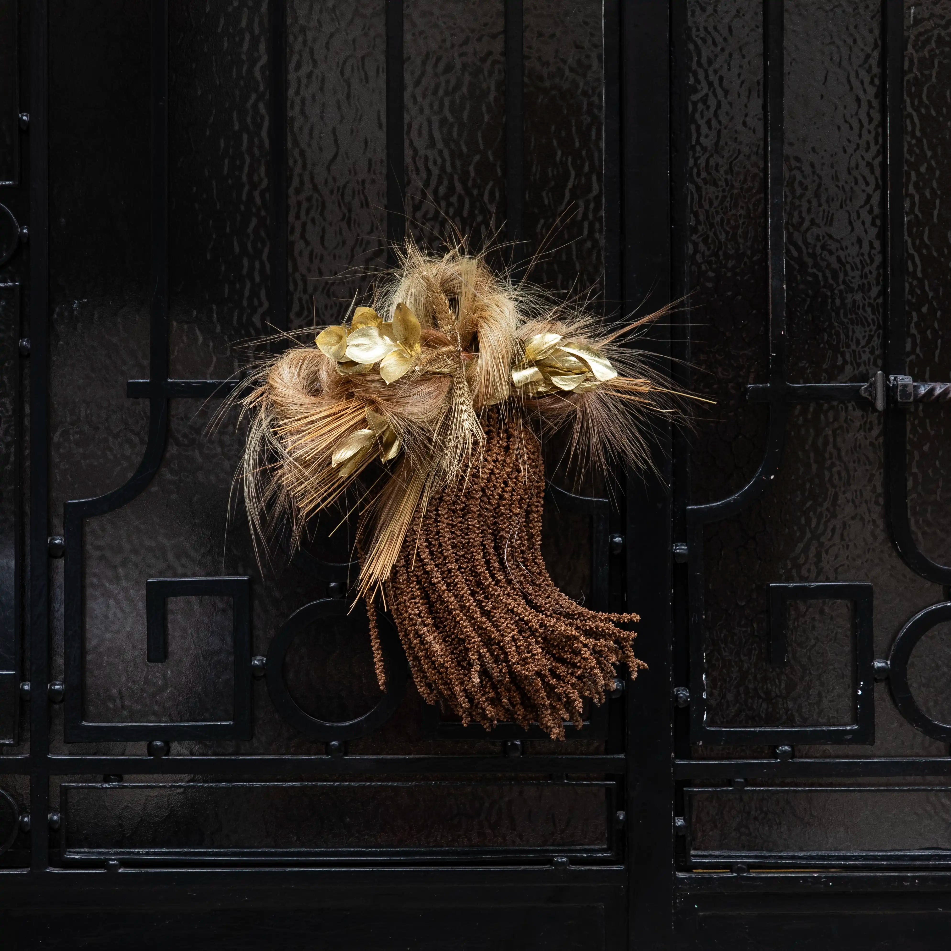 Création DEBEAULIEU à suspendre, composée d'une grappe de cariota, de blé de porte-bonheur et de végétaux dorés.
