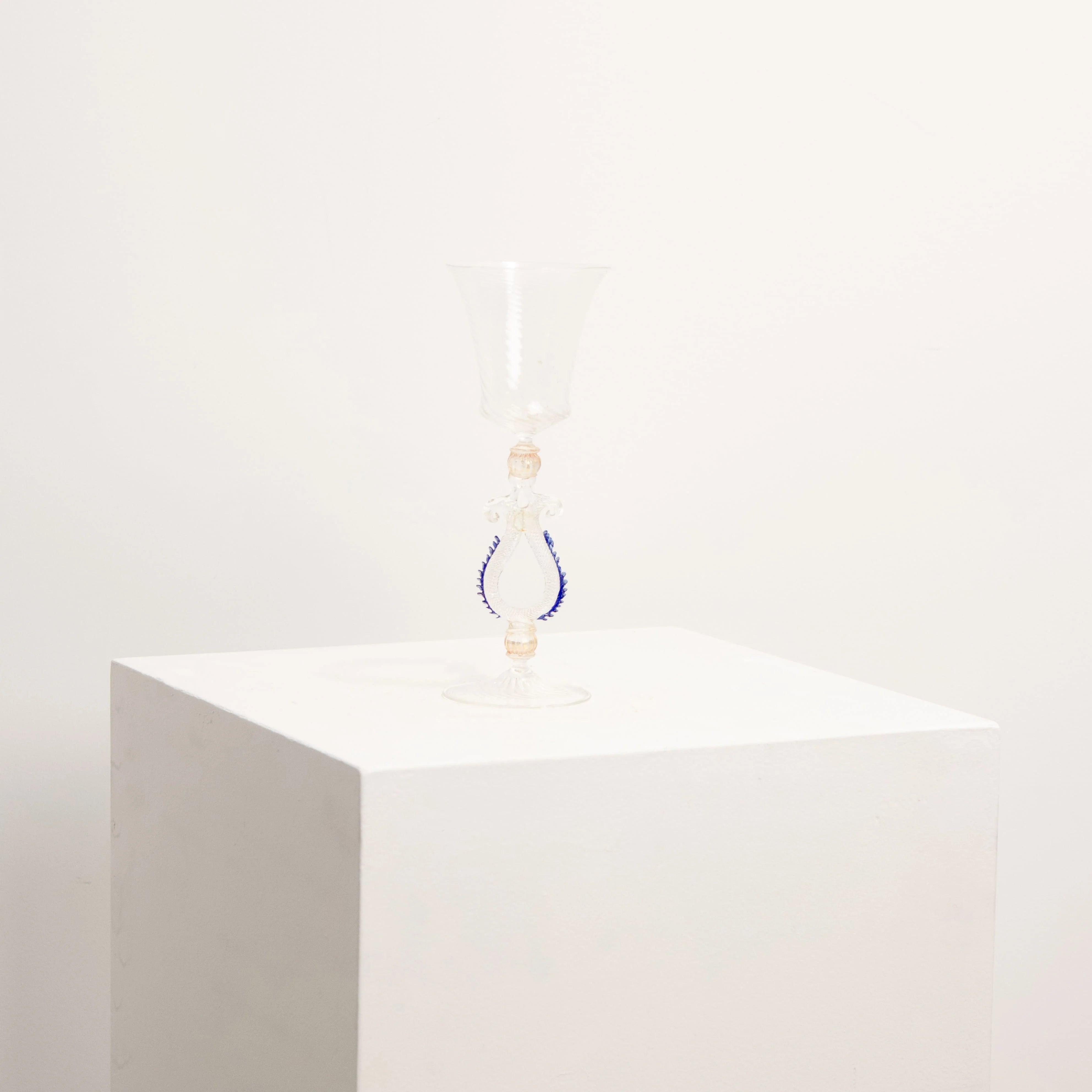 Spectaculaire pièce de verrerie d'art dans le goût des productions baroques de Murano. Ce verre à jambe captive immédiatement par la complexité de son architecture et la finesse de son exécution.