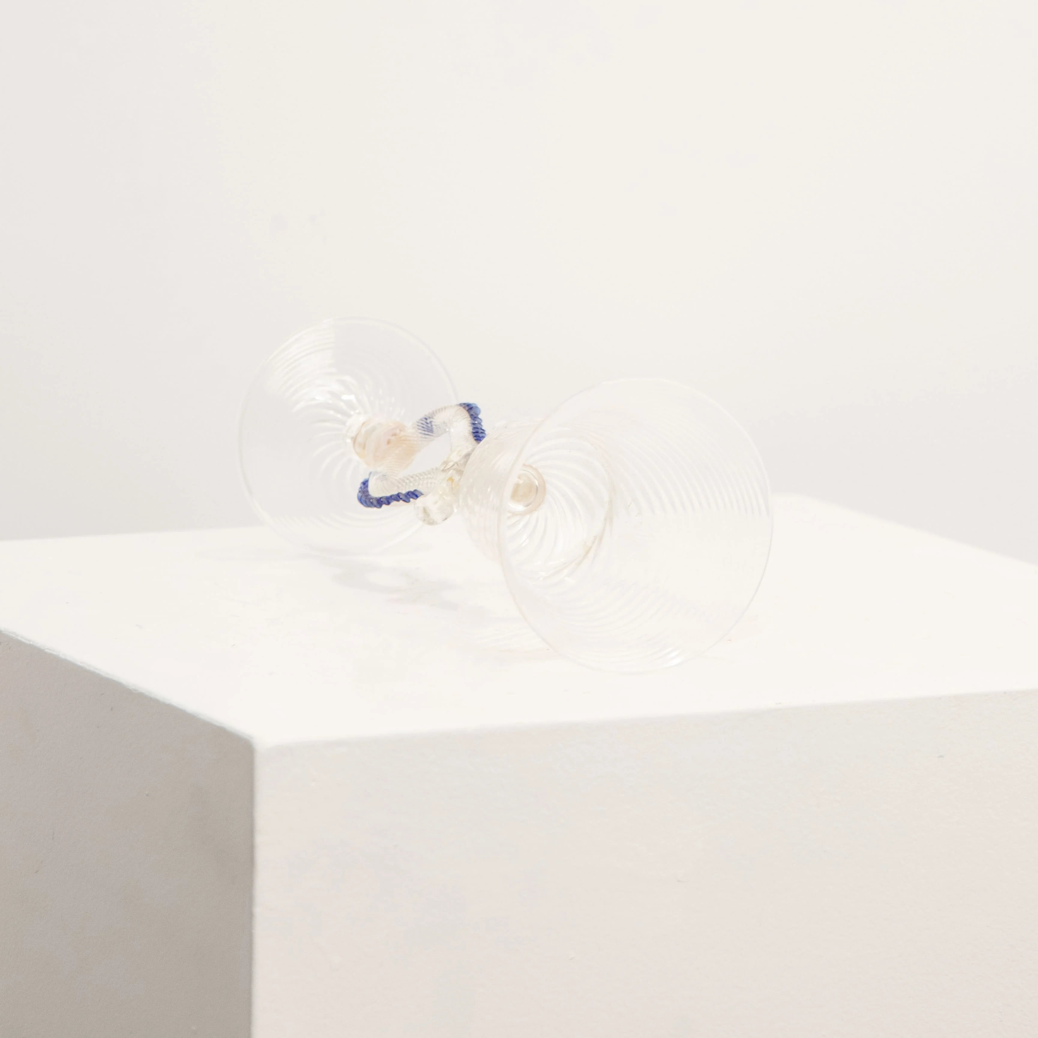 Son pied constitue une véritable sculpture. Deux dragons stylisés aux corps entrelacés soutiennent la paraison avec légèreté. Ils sont rehaussés de crêtes en verre bleu intense et de nœuds gorgés de fines inclusions d'or aventurine qui scintillent précieusement. Le calice et la base présentent un délicat travail de torsades optiques qui joue avec la transparence de la matière.