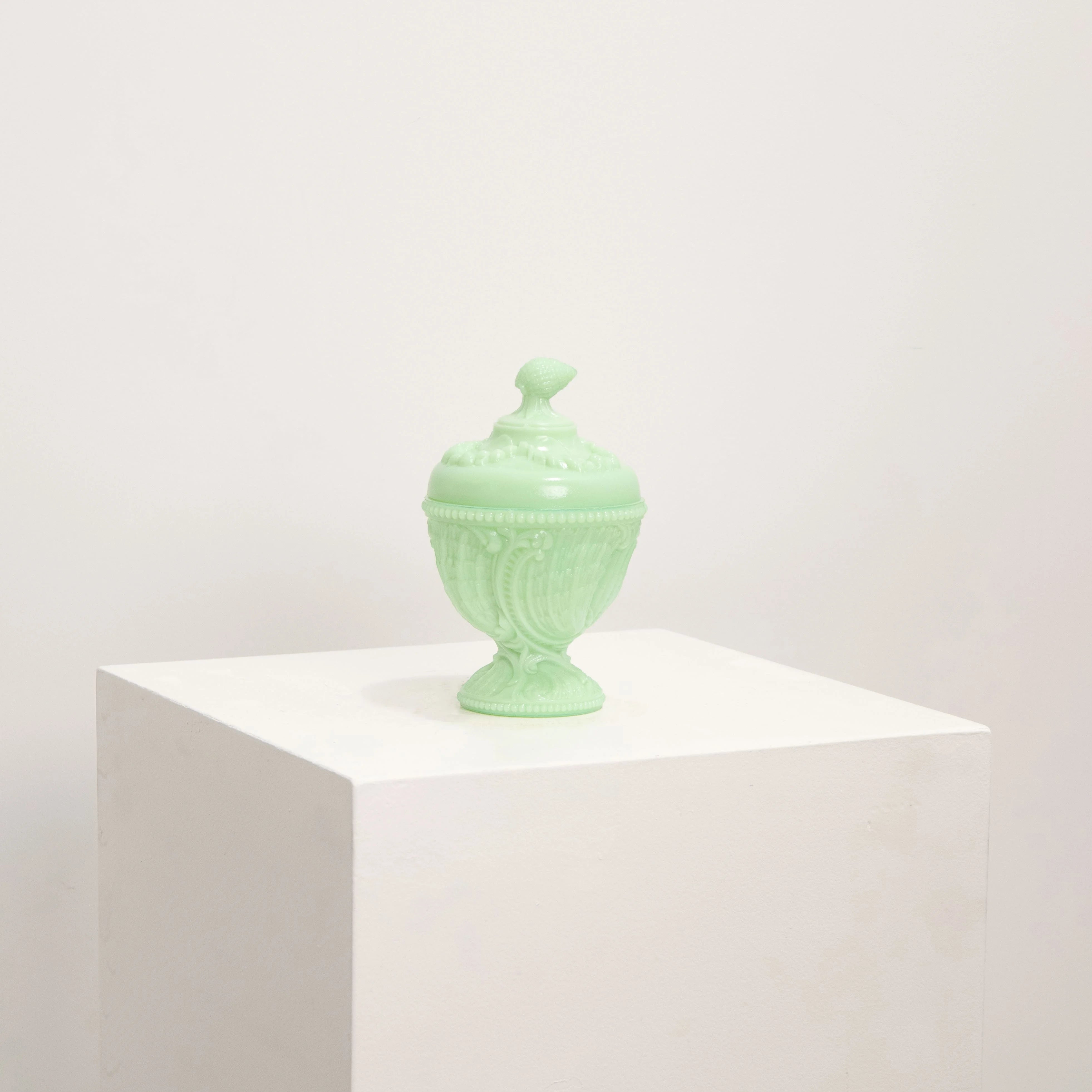 Délicat drageoir sur piédouche, cette pièce est emblématique du savoir-faire des manufactures lorraines. Elle se distingue par sa superbe teinte "Jadeite", un vert tendre et laiteux particulièrement recherché par les collectionneurs.