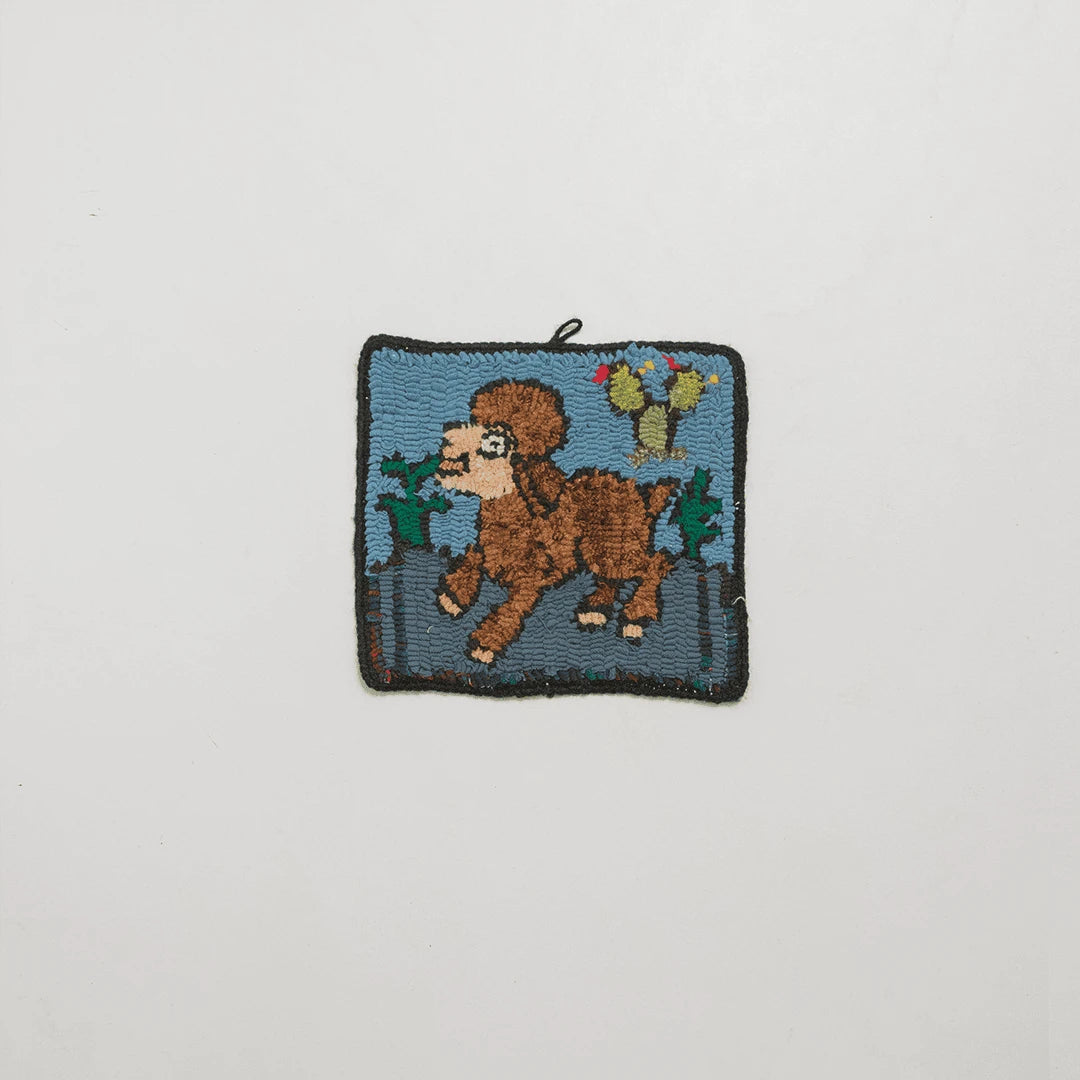 Chaque pièce est rigoureusement unique. La collection dévoile un bestiaire coloré et naïf, mettant en scène des chiens, des chats, des lapins ou des oiseaux exotiques au cœur de décors floraux chatoyants, le tout encadré par une épaisse bordure foncée contrastante.