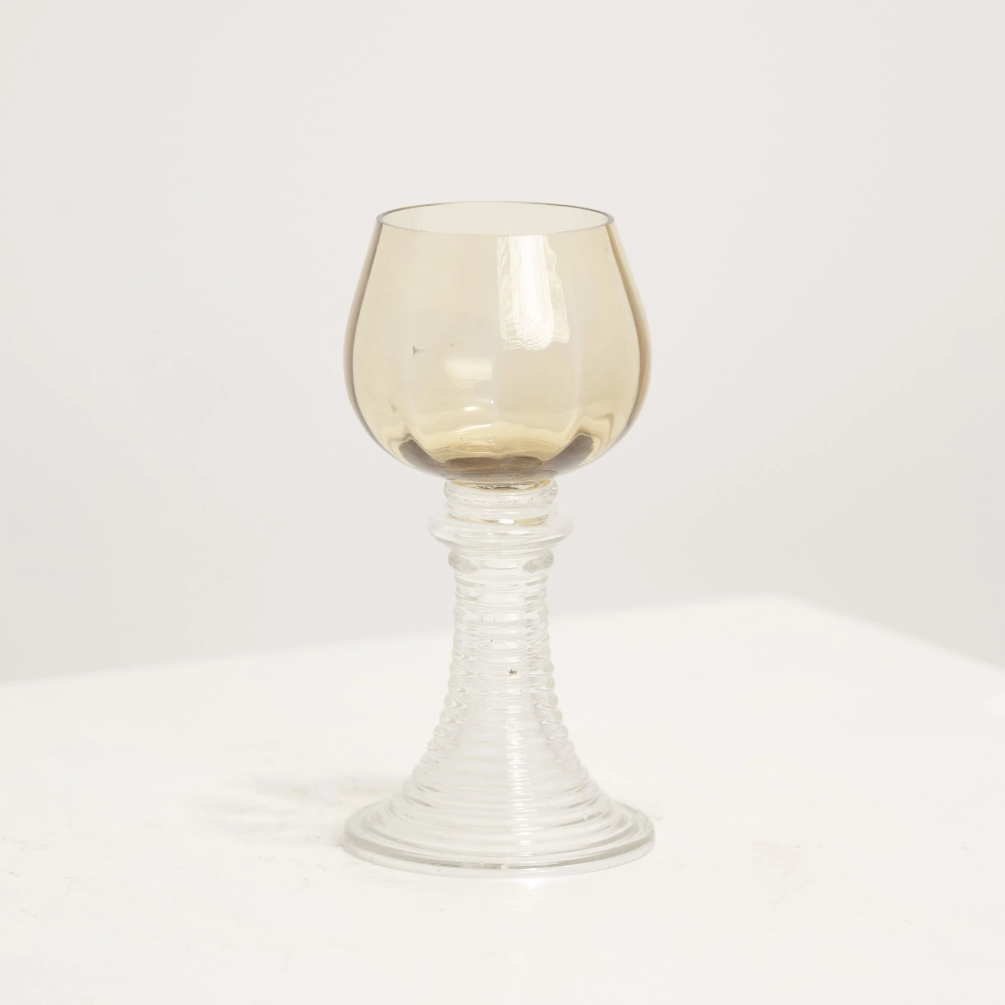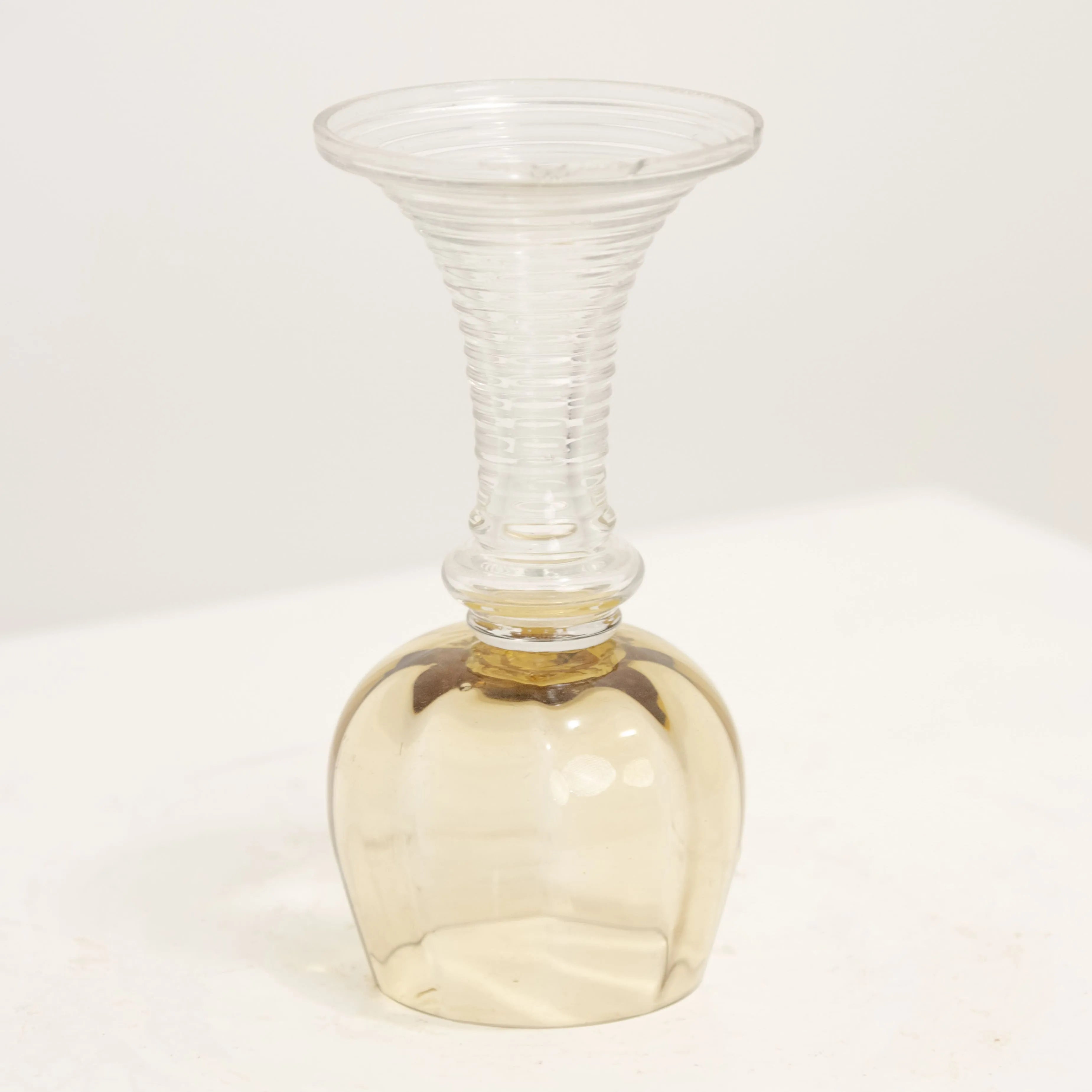 Duo de verres vintage au design bicolore emblématique des années 70. Cette production se distingue par l'élégance de son calice à la teinte ambre "tabac blond", monté sur un pied en verre transparent très travaillé.