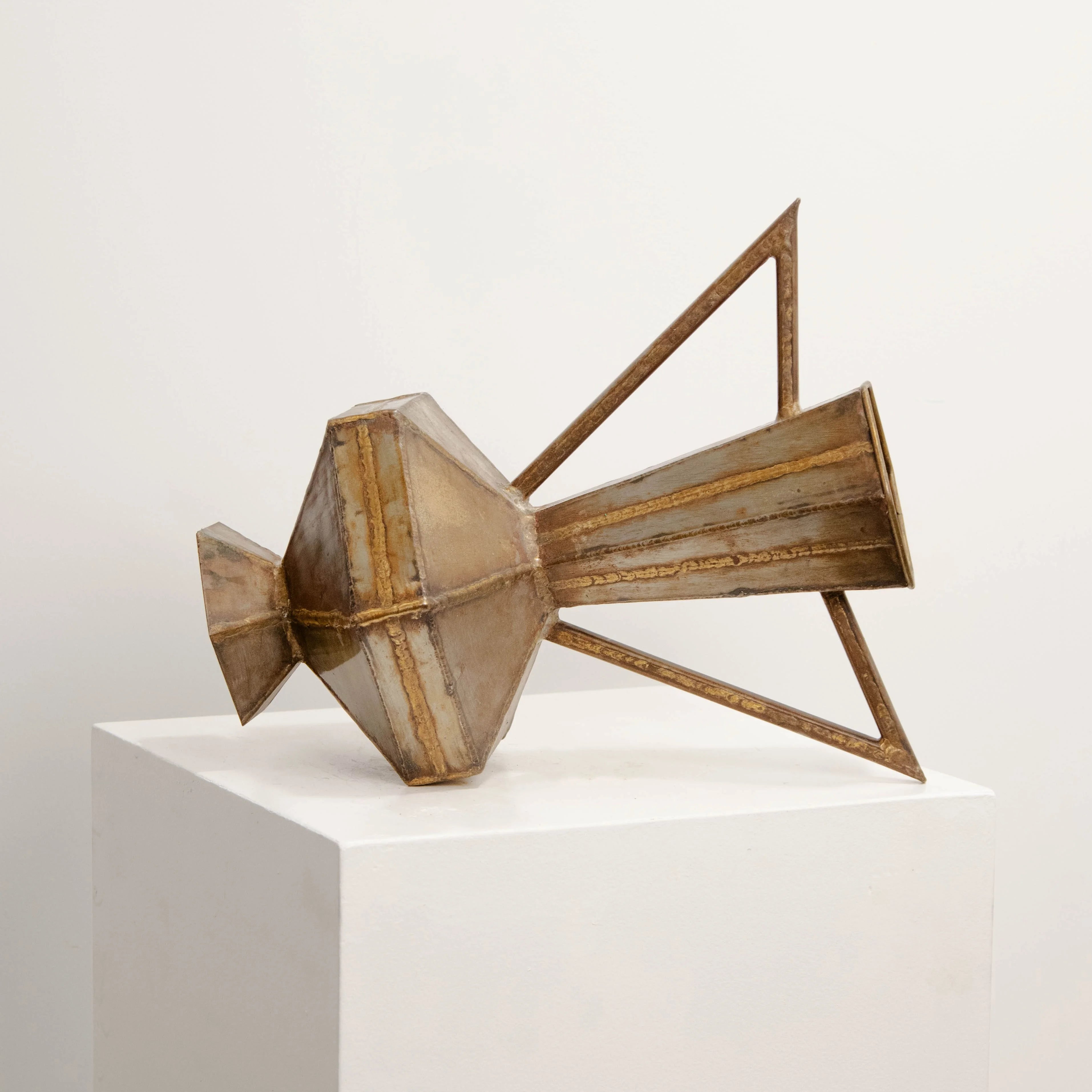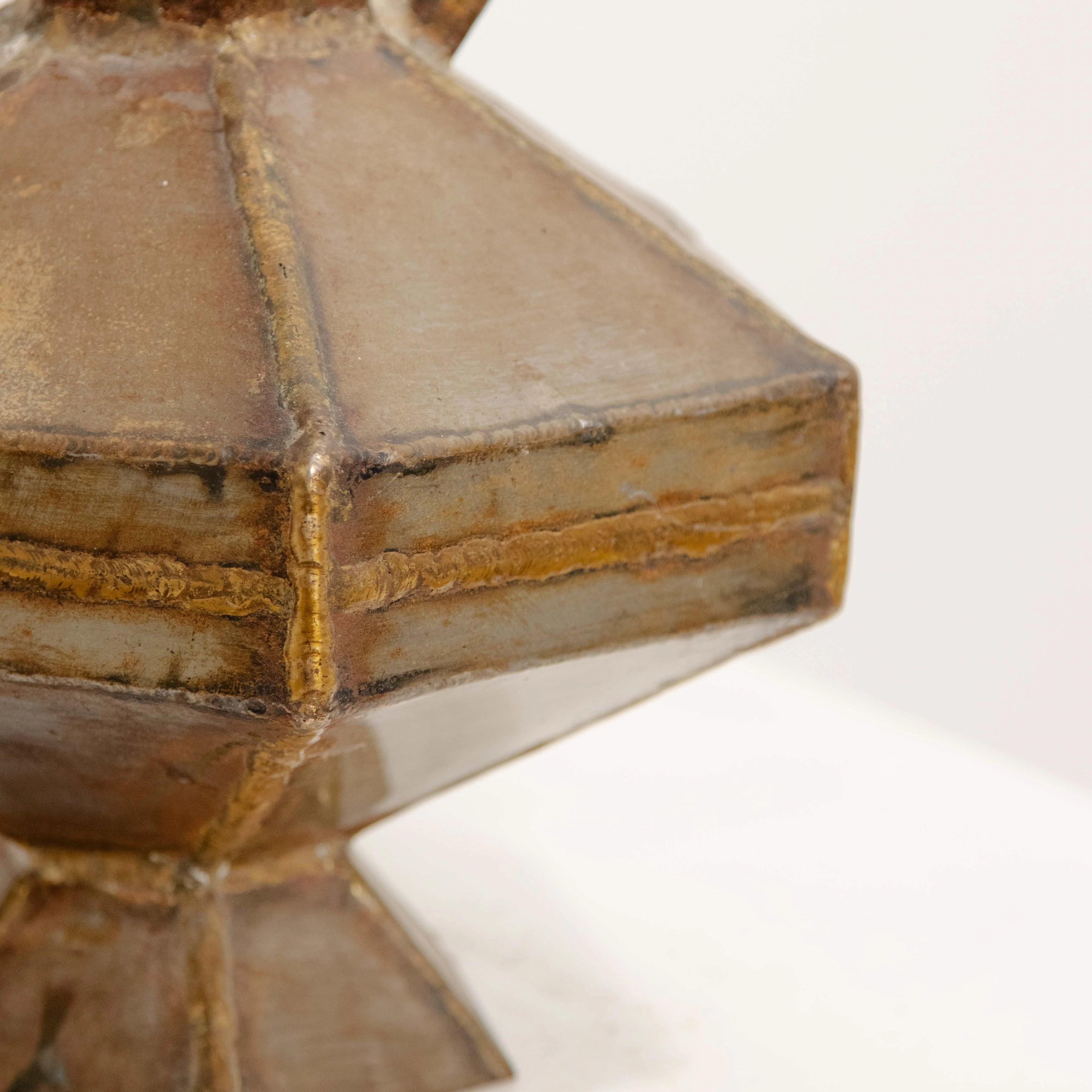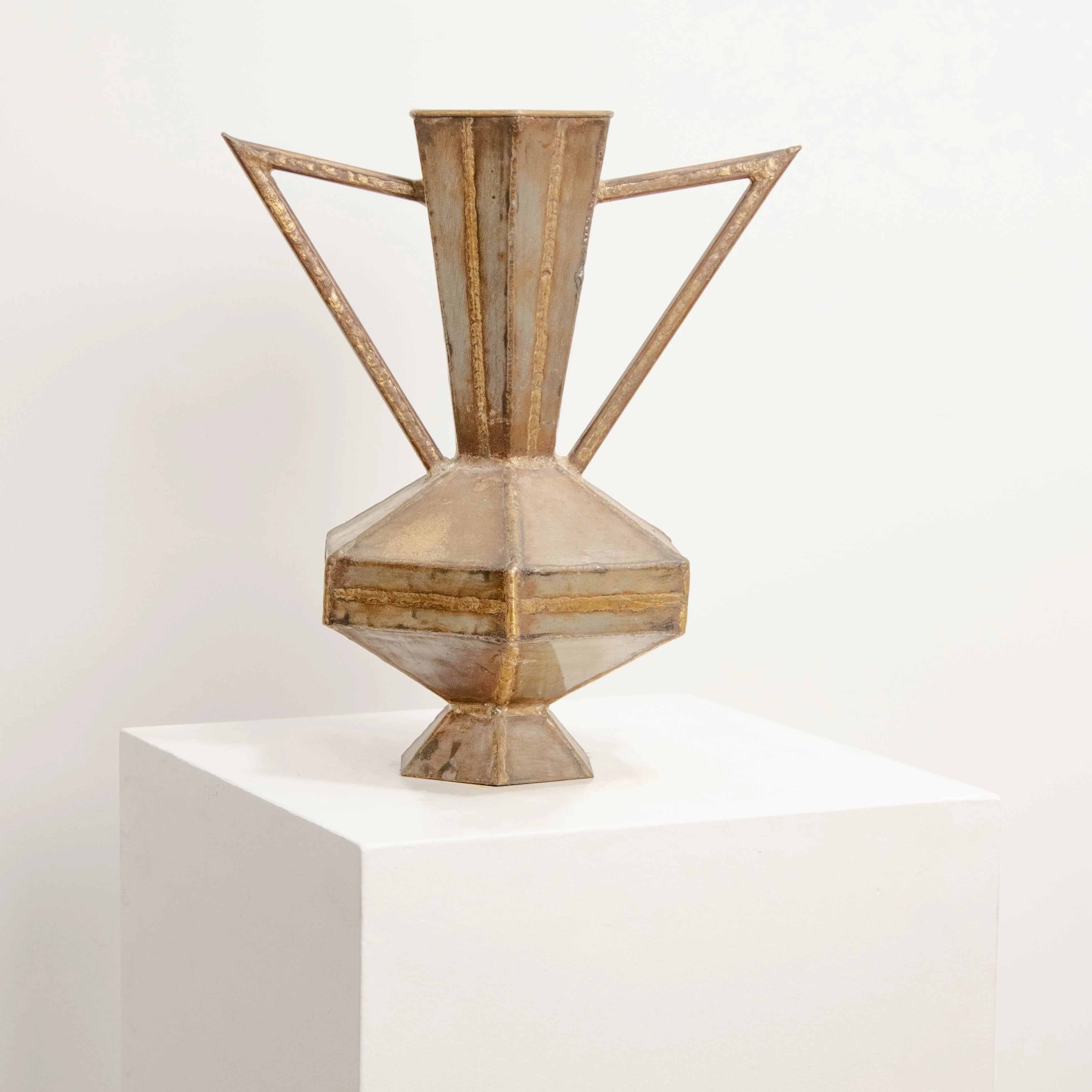 Véritable sculpture domestique dans le style Art Déco. Vase captive par son allure brutaliste et ses lignes géométriques audacieuses. Sa structure en métal patiné aux reflets gris acier est soulignée par des soudures apparentes dorées qui dessinent son architecture comme une ossature précieuse.