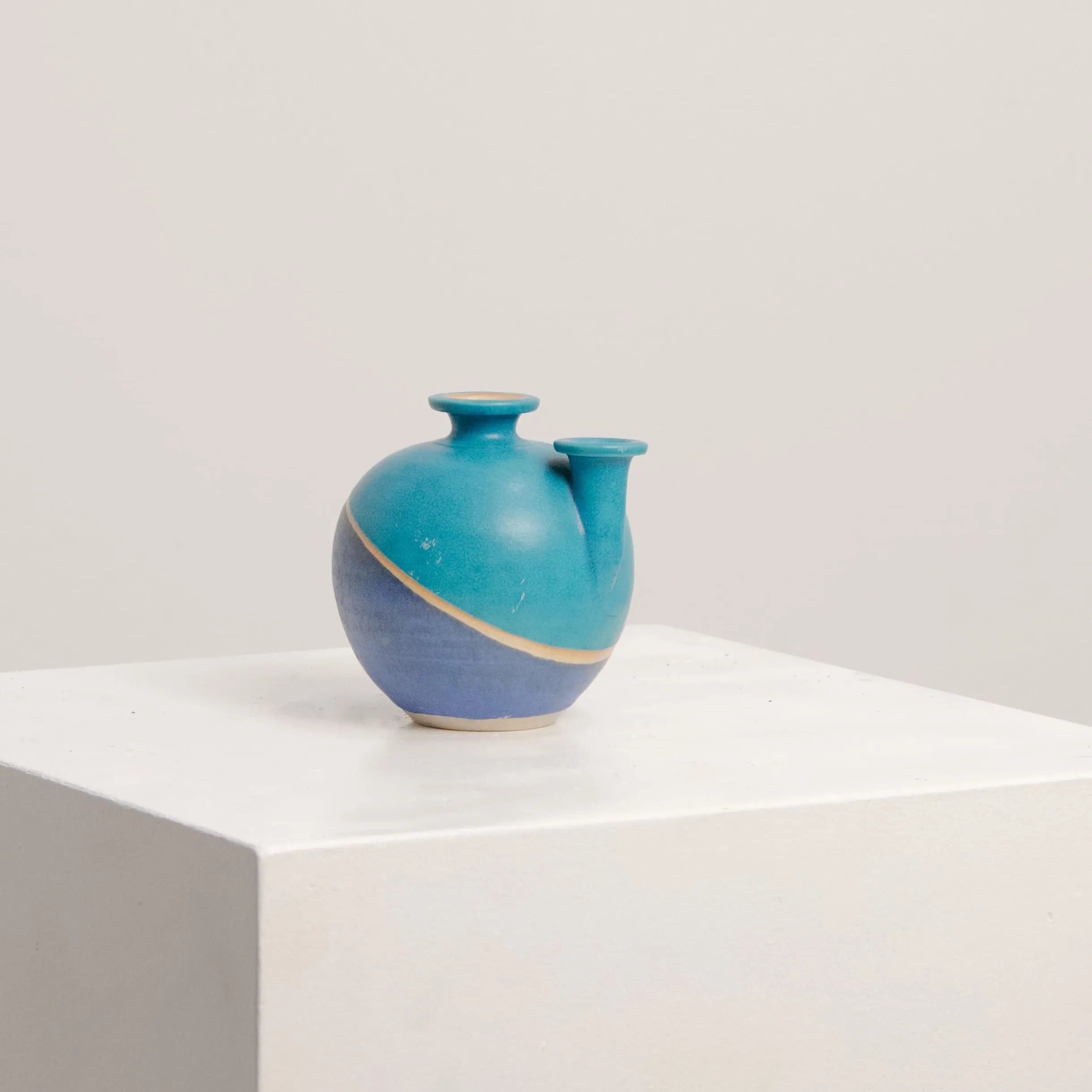 Singulier petit vase sphérique en céramique émaillée mate. Se distingue par sa forme originale dotée de deux goulots asymétriques, séparant un bleu turquoise lumineux d'un bleu outremer par une fine ligne de terre brute. Signé KK.