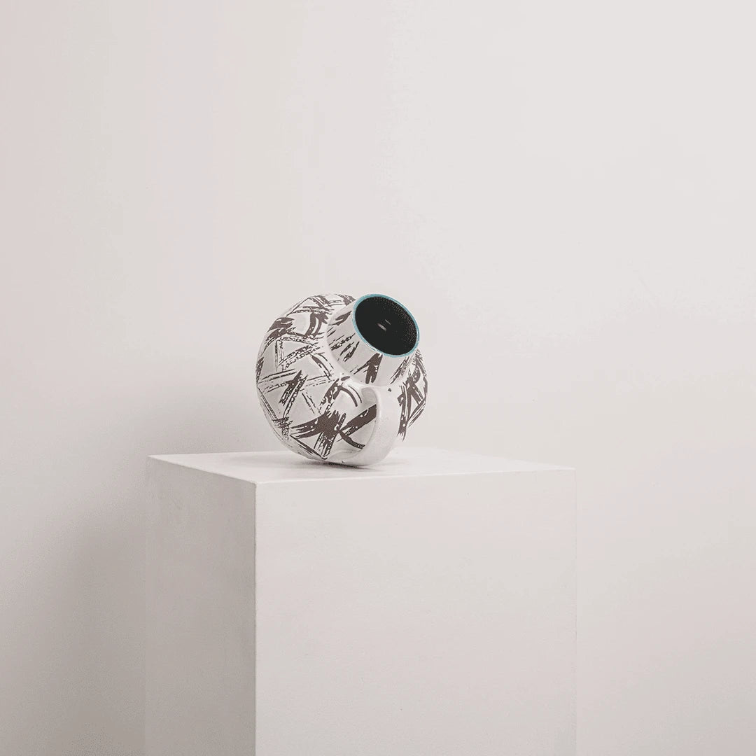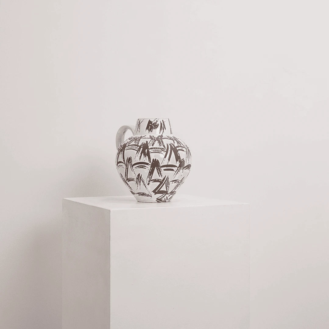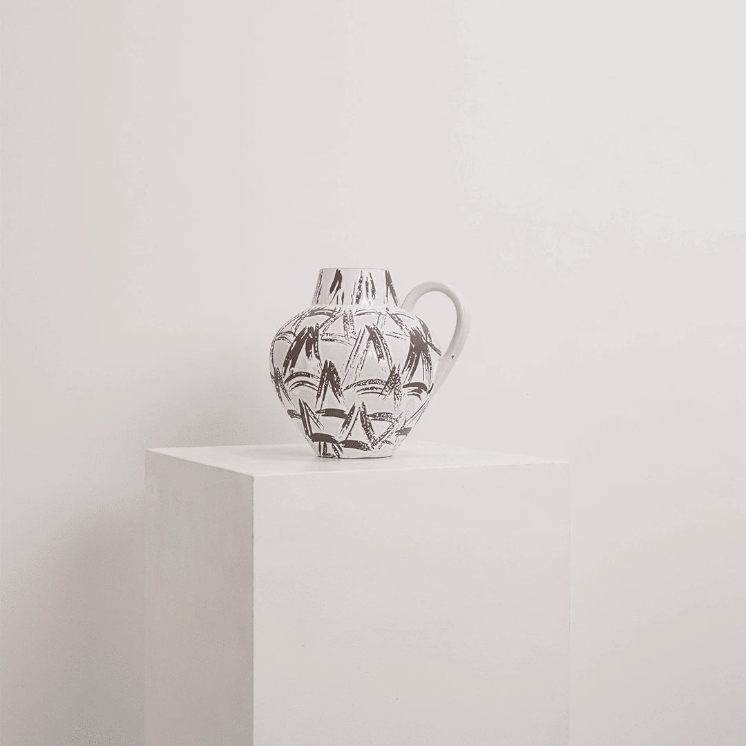 Son décor en réserve est une prouesse technique : un émail blanc brillant, au motif organique tourbillonnant, est appliqué avec précision sur un fond noir mat et profond, créant un contraste visuel dramatique. La silhouette est généreuse, dotée d'une anse ergonomique et d'un bec verseur affirmé. L'intérieur surprend par sa couverte d'un bleu pétrole lumineux et profond. La base porte la double inscription incisée "698-23" et "W-GERMANY", attestant de son origine.