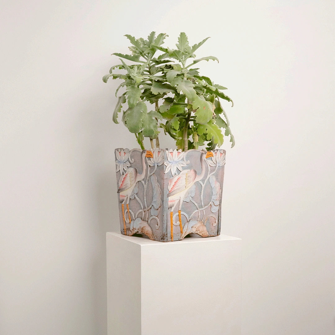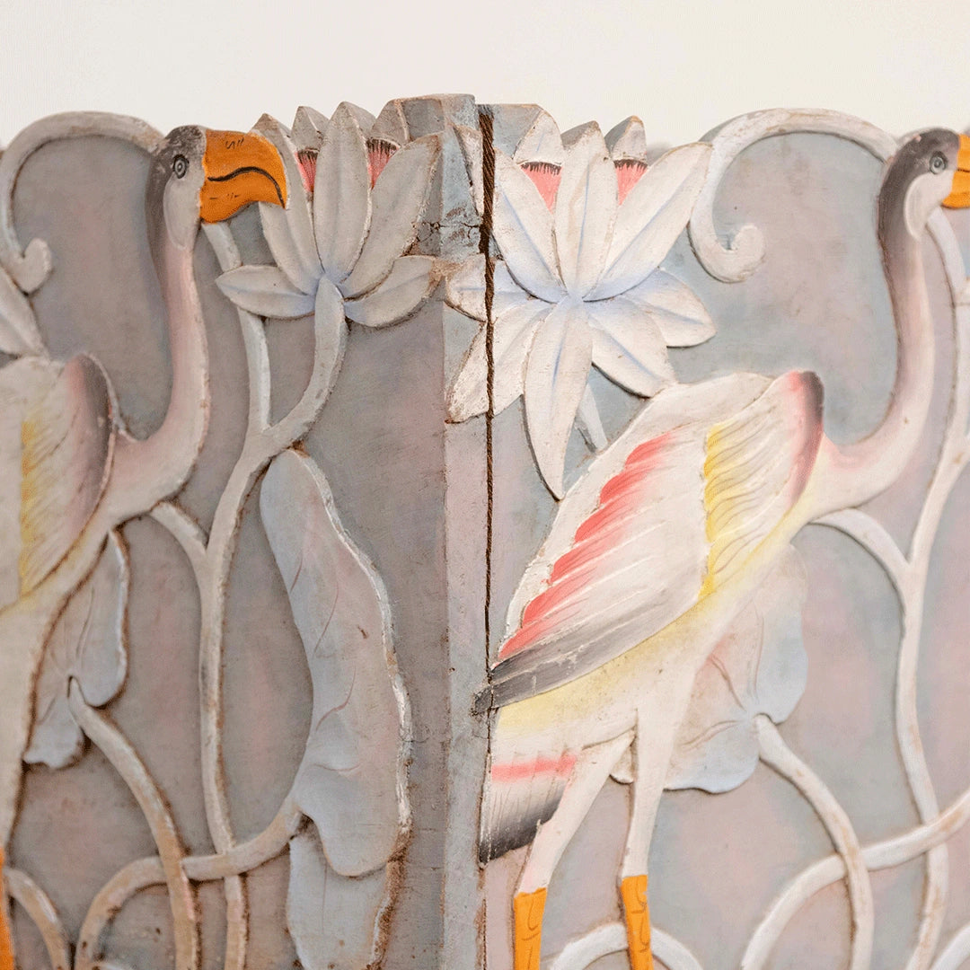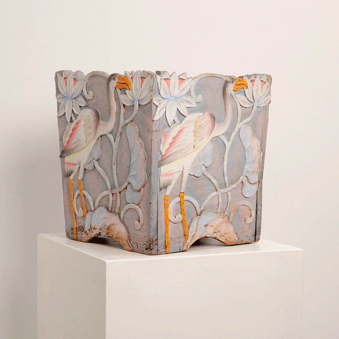 Singulier cache-pot de forme carrée en bois sculpté et peint. Cette pièce au charme vintage se distingue par son riche décor en haut-relief d'inspiration naturaliste. Sur ses faces se déploie un paysage aquatique poétique mettant en scène un oiseau échassier évoluant parmi de grandes fleurs de lotus et de larges feuilles nervurées.