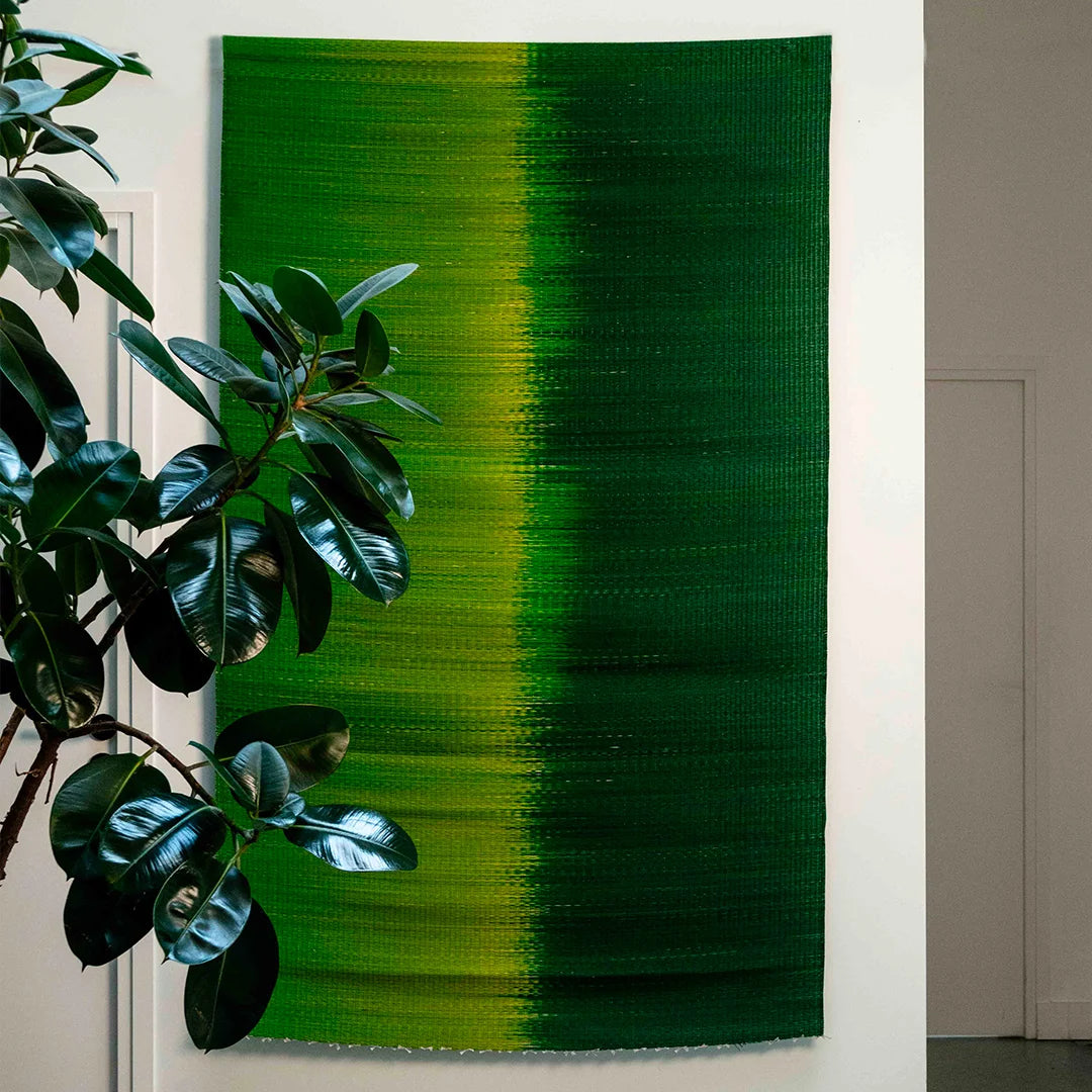 Lumineuse et vibrante, elle déploie un remarquable travail de teinture en dégradé, déclinant un camaïeu de verts intenses et profonds.