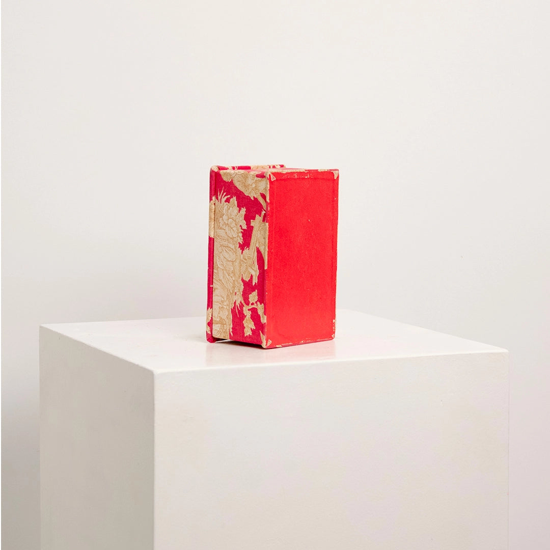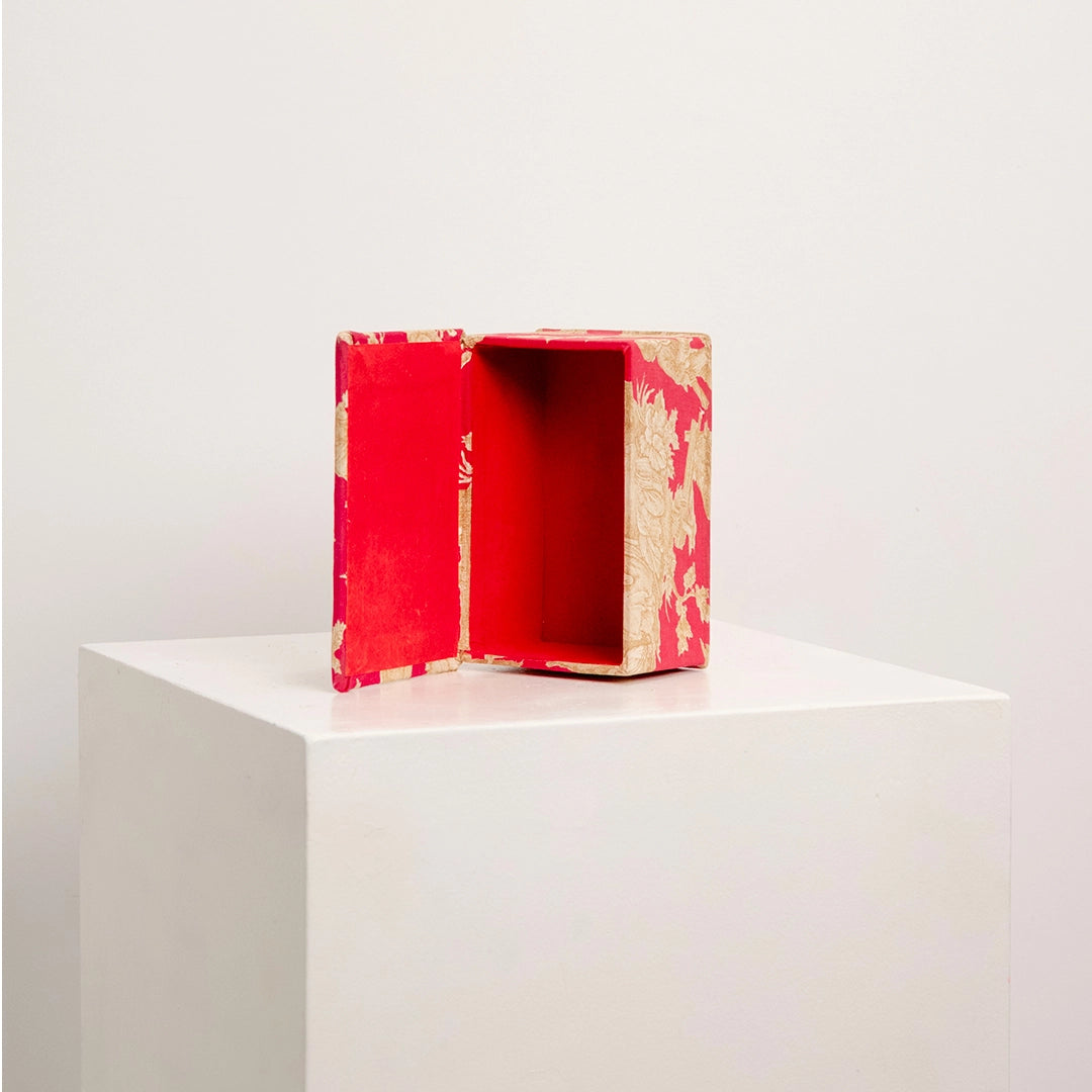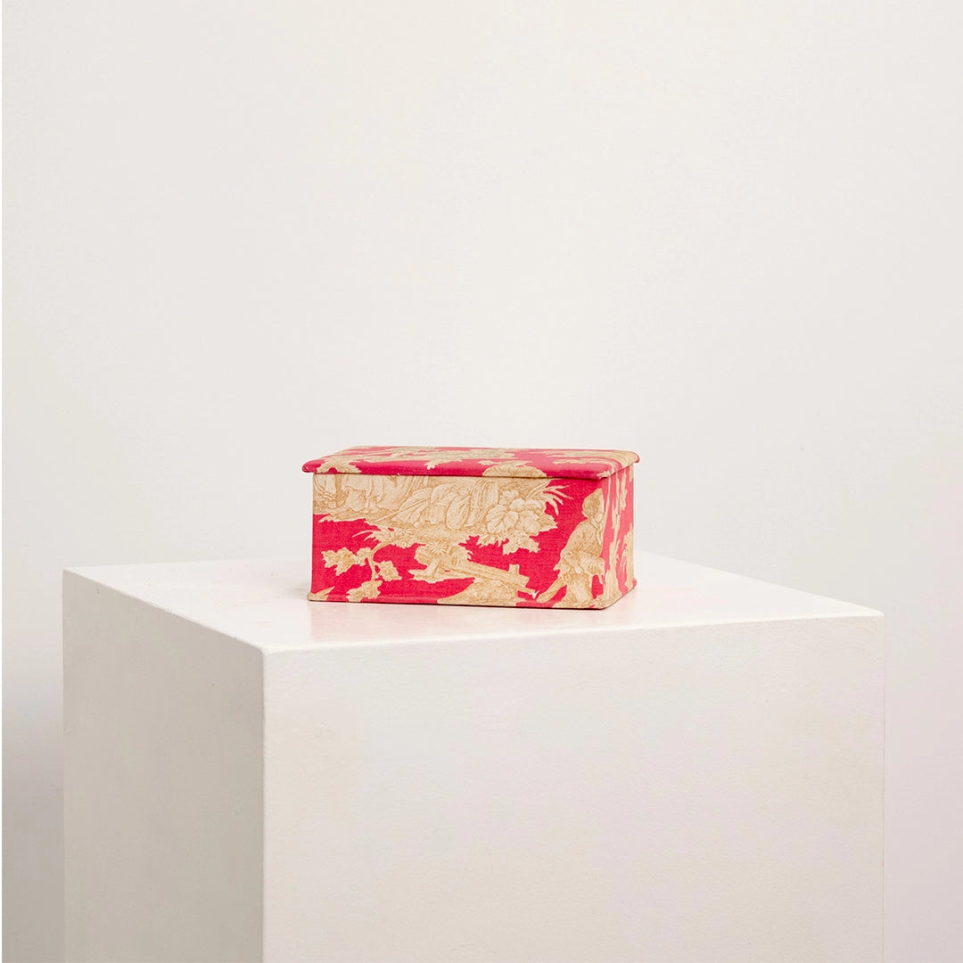 Élégante petite boîte de rangement, recouverte d'un tissu reprenant les codes incontournables de la Toile de Jouy. Sur un fond rose framboise intense se déploient des scénettes pastorales traditionnelles dans des teintes beiges, offrant un délicieux contraste et un charme romantique intemporel.