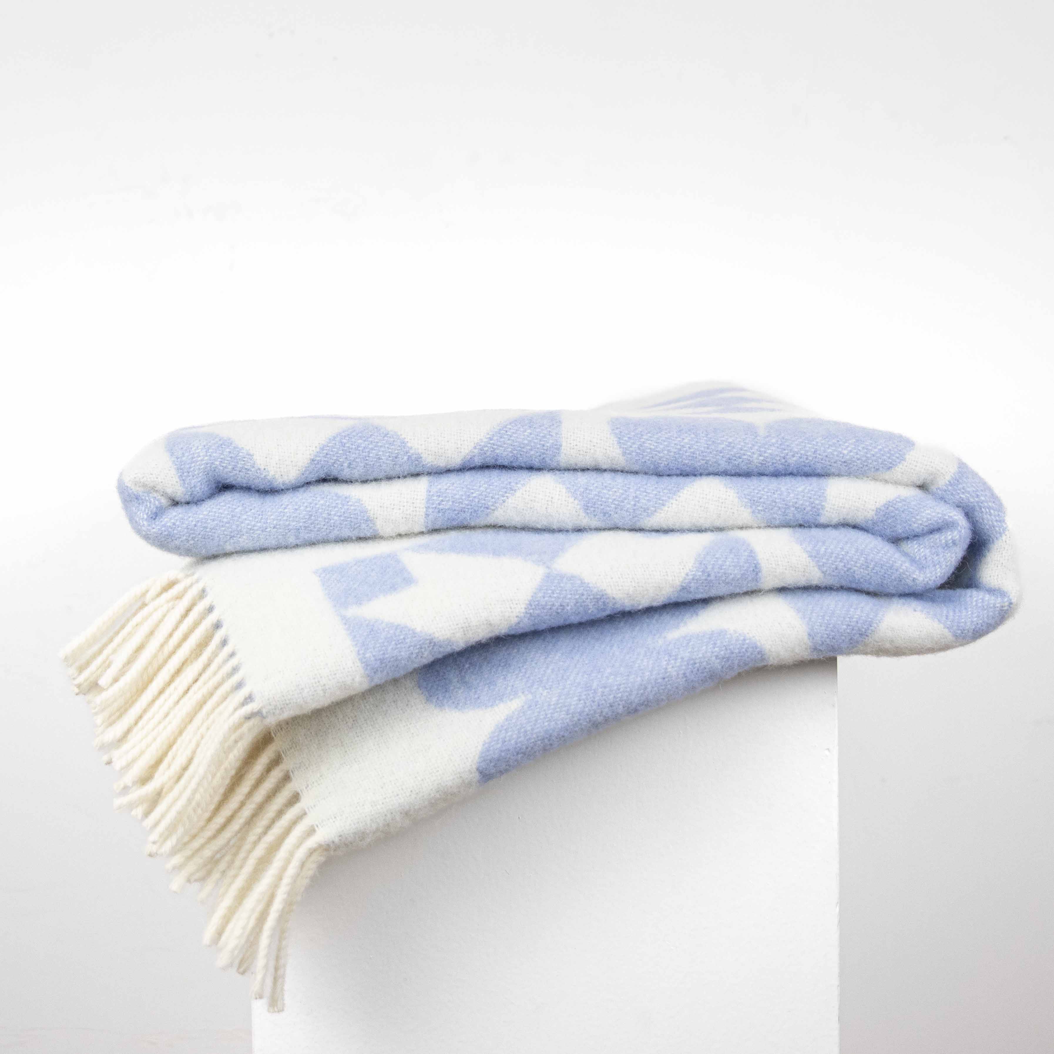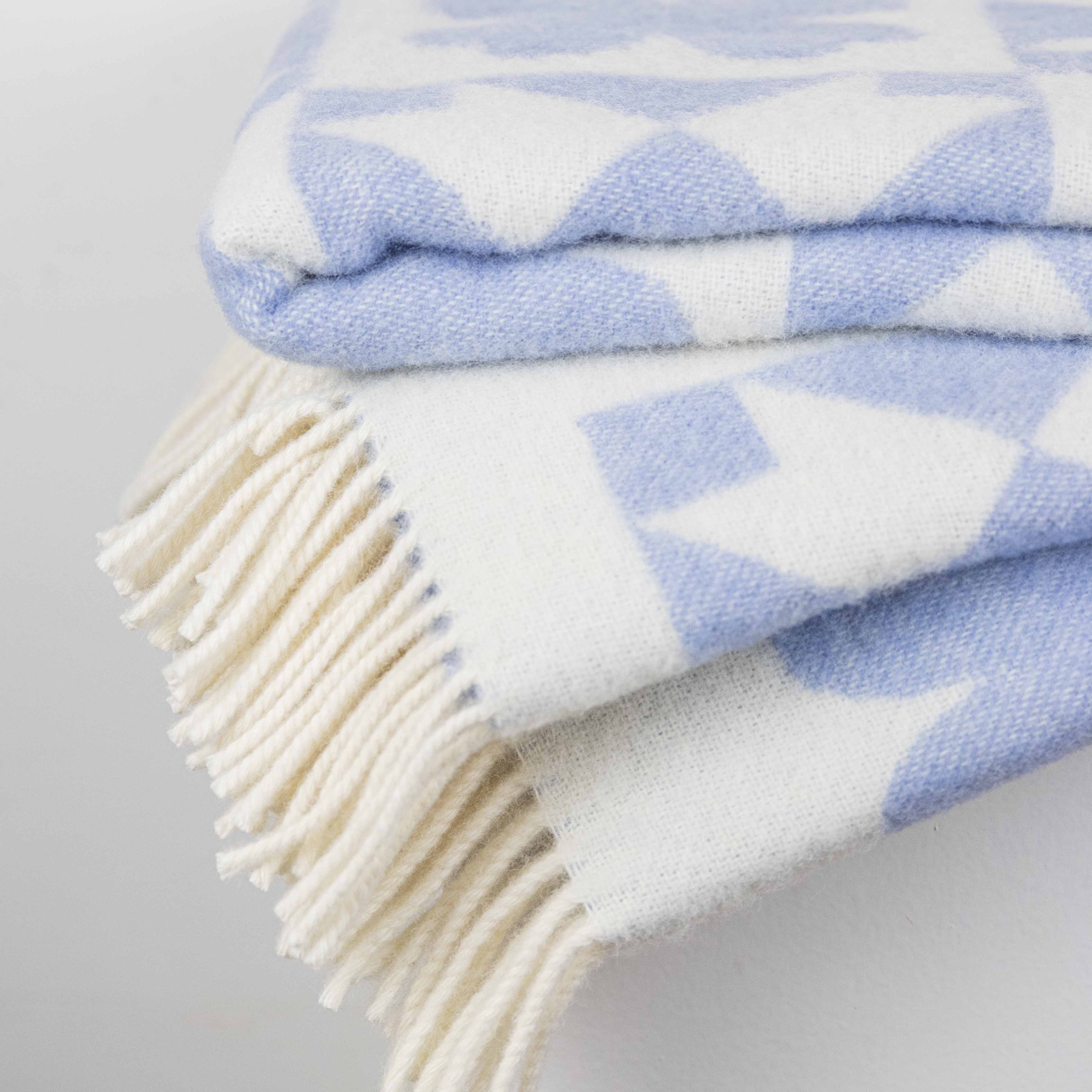 Magnifique plaid en laine aux teintes douces bleu ciel et blanc. Son décor graphique, mêlant géométrie et trèfles stylisés, apporte une touche de fraîcheur et d'élégance intemporelle.