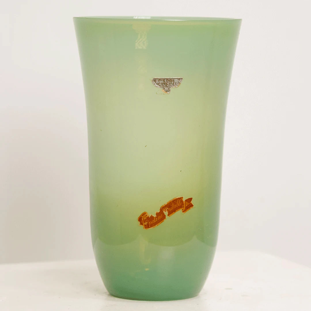 Il a conservé ses deux étiquettes d'origine, garantes de son authenticité : la première, dorée et en forme d'écusson, porte le nom "Pierre Schneider", tandis que la seconde, en forme de ruban, précise "Opaline Véritable". La base est lisse et soignée.
