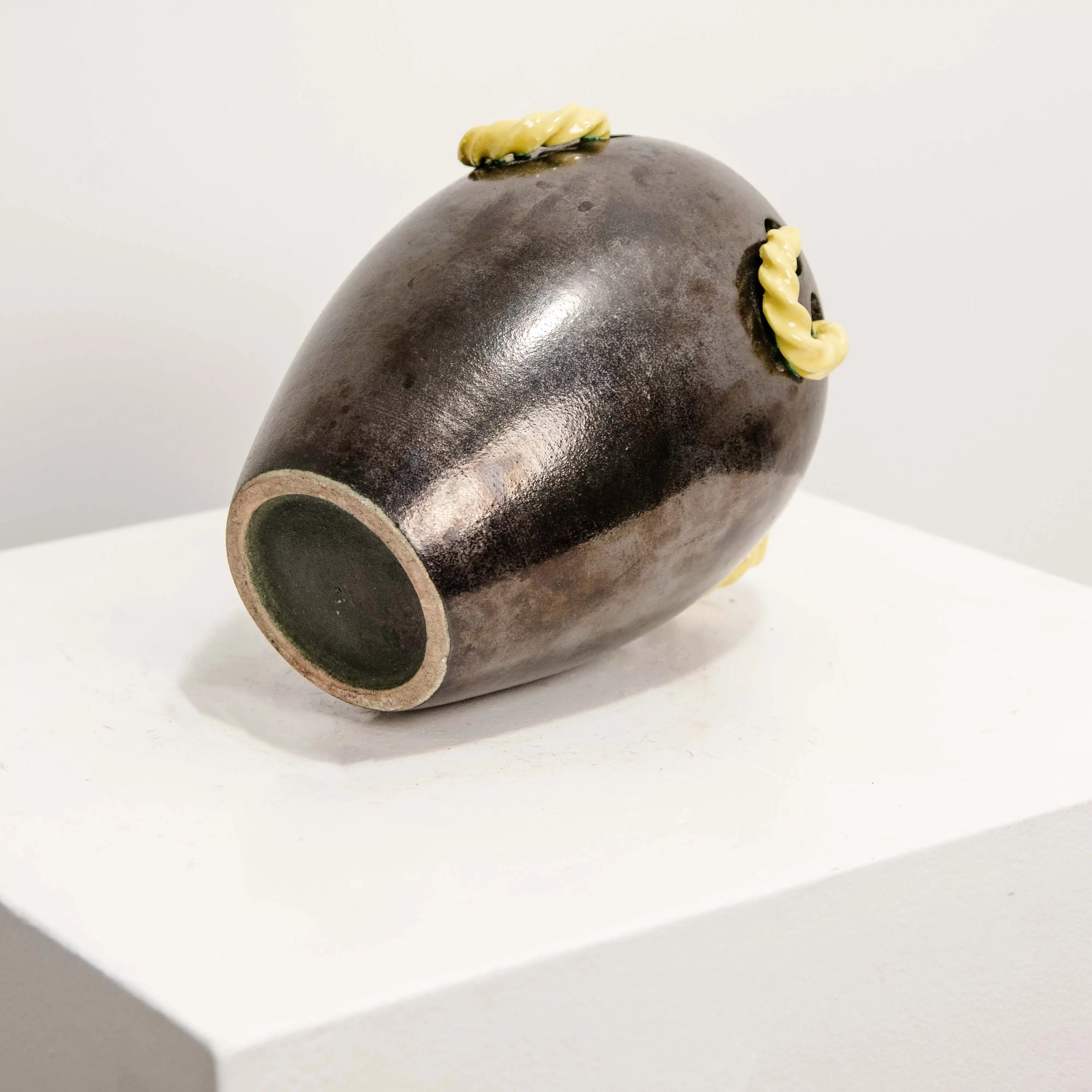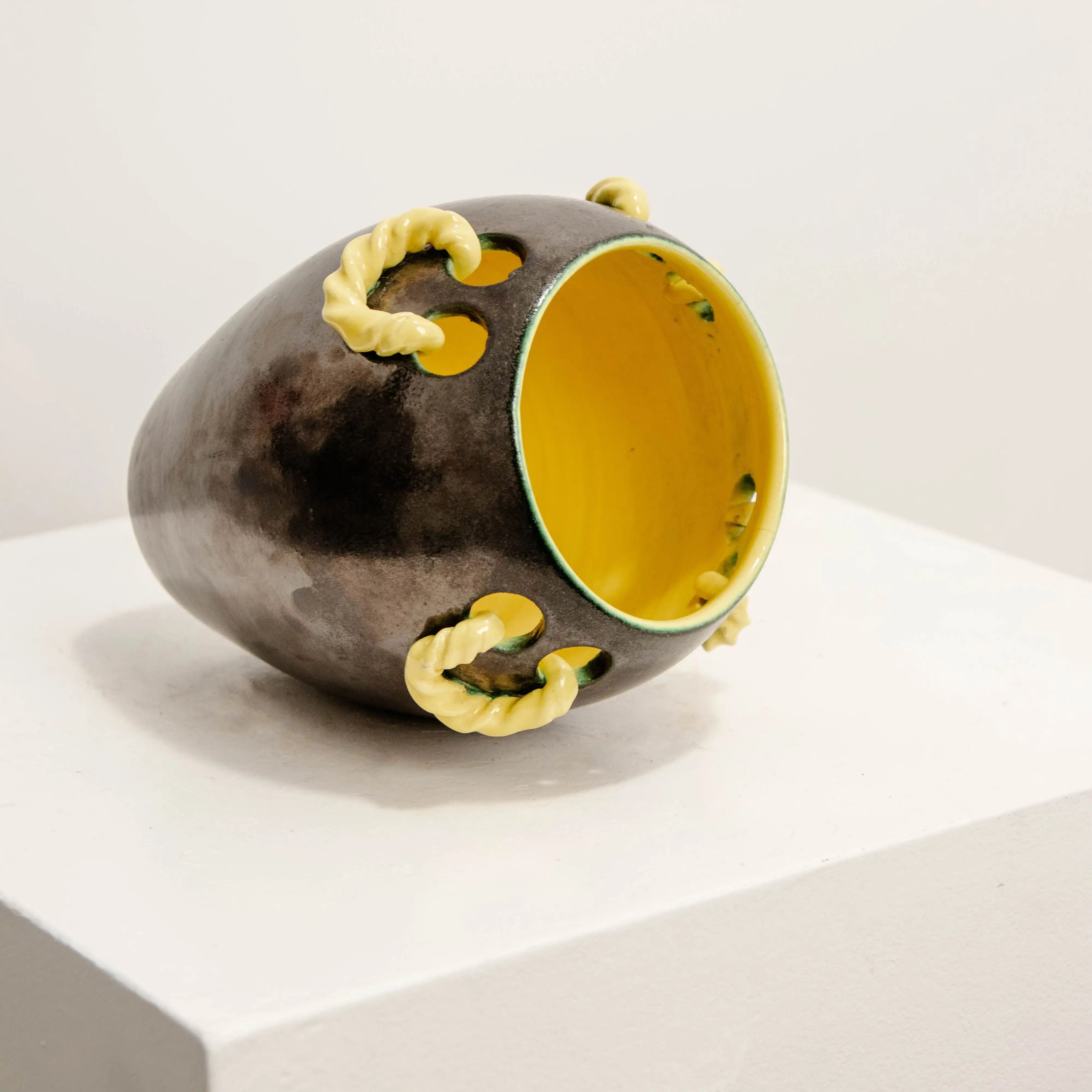 Ceramic vase decorated with yellow twists. Two-tone glaze, black body and yellow interior.
