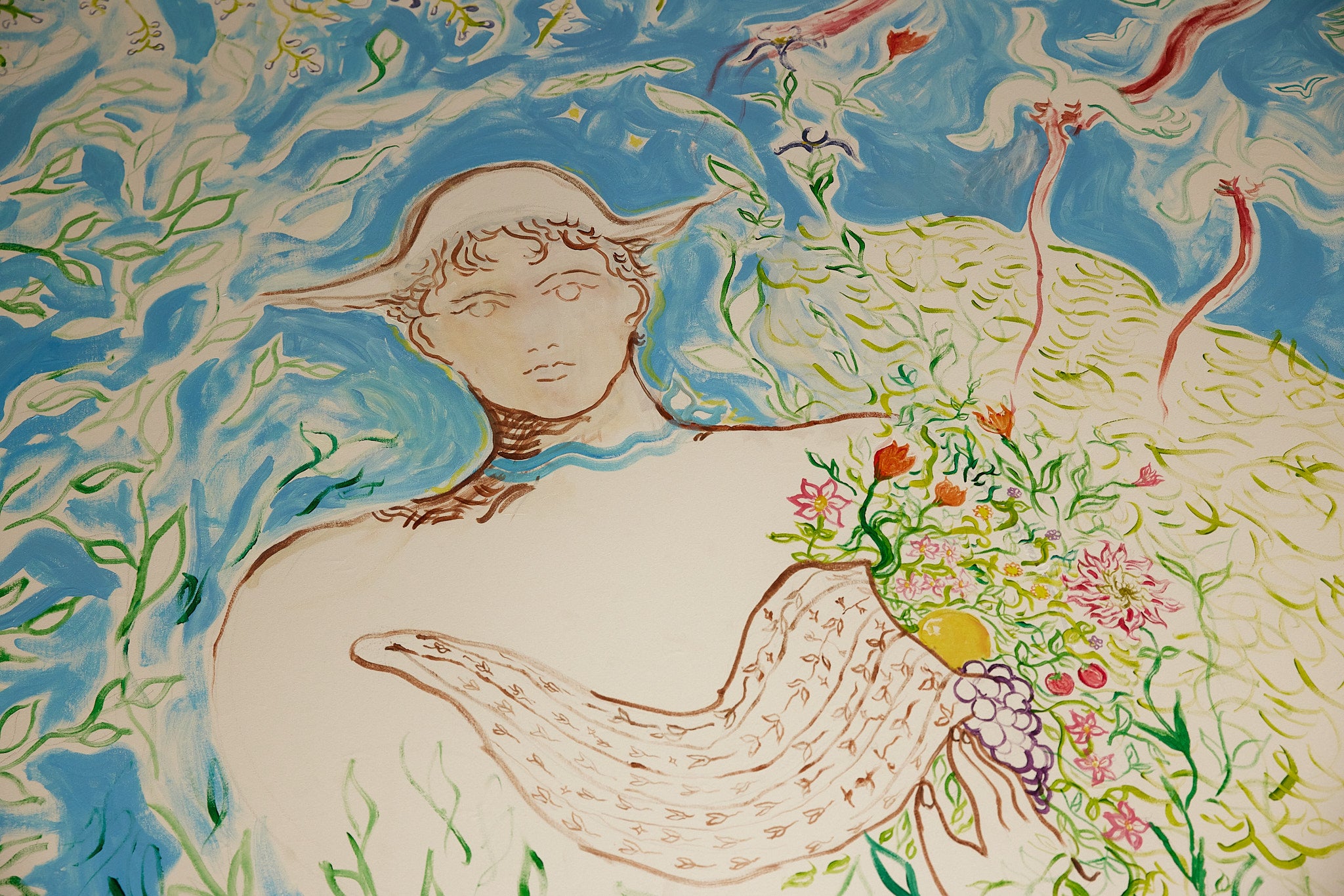 Un jardin d’hiver, à mi-chemin entre l’expression du classicisme des jardins à la française, des murs recouverts de treillages, une fresque onirique de Jacques MERLE offrent au lieu une certaine poésie.