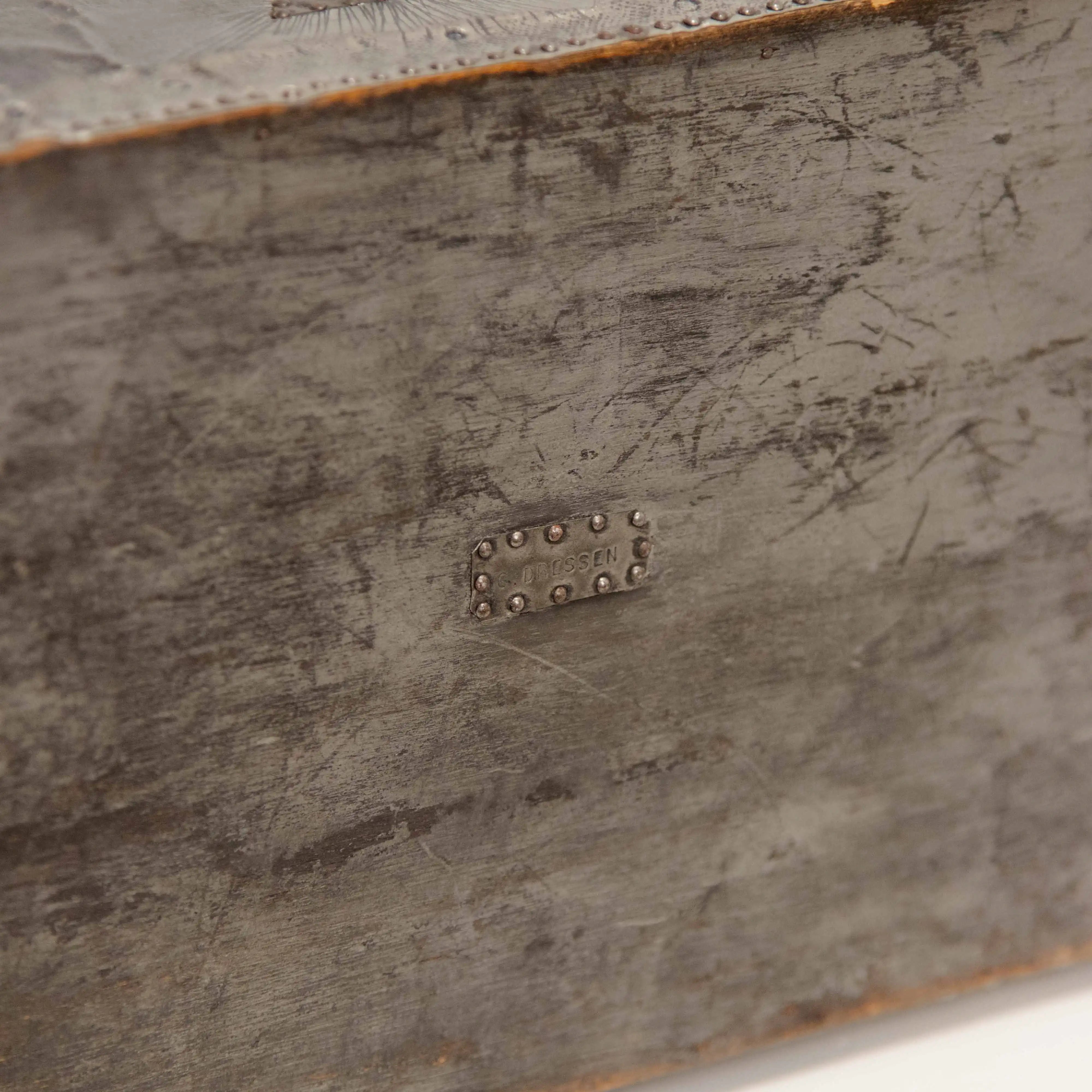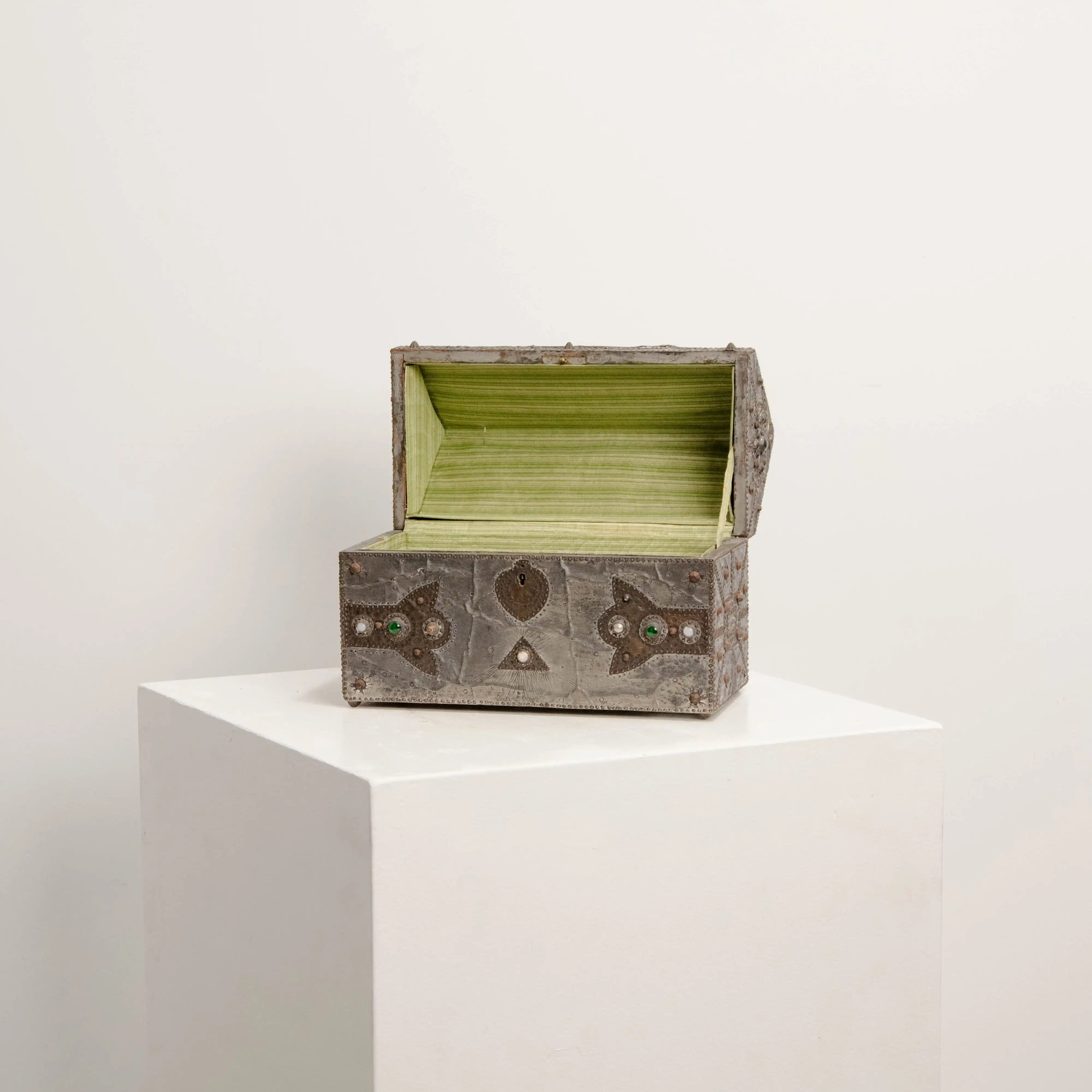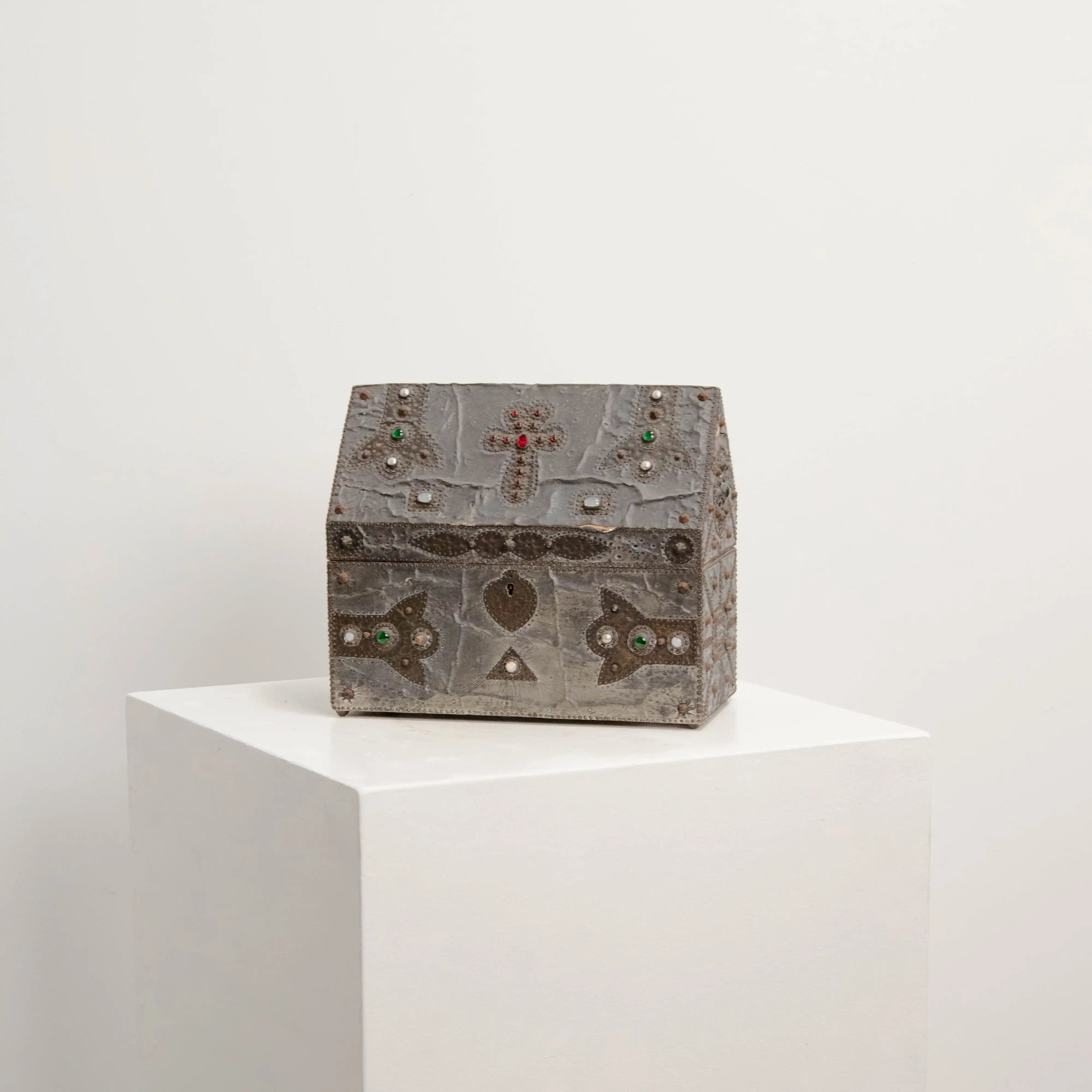 Une pièce de caractère à l'allure brutaliste et précieuse. Ce coffret en métal patiné, adopte la forme architecturale d'une maisonnette au toit pentu. Sa surface est richement ornée d'un travail de repoussé et clouté, incrusté de cabochons de verre aux teintes de pierres précieuses (rouge rubis, vert émeraude et opaline).