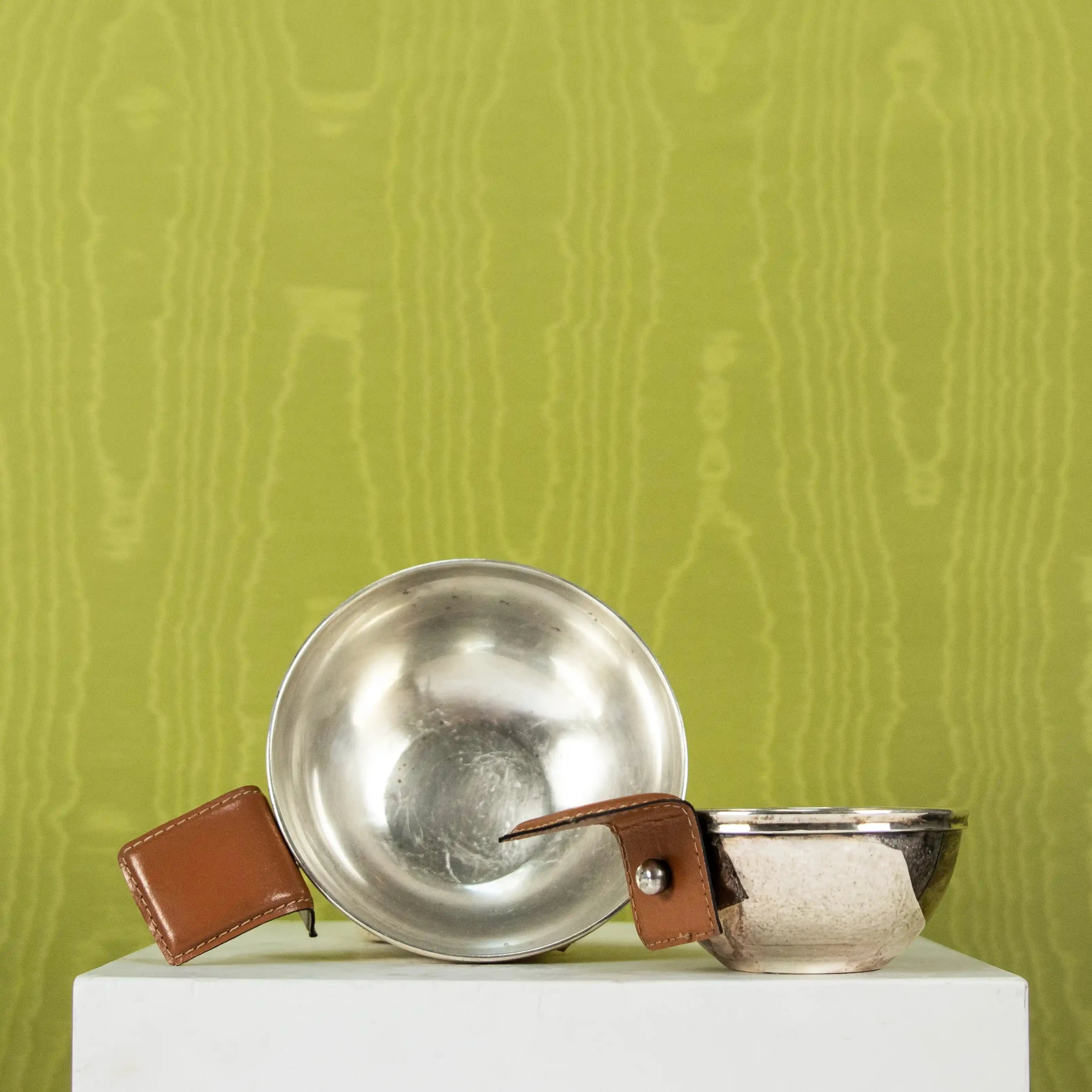 Magnifique paire de coupes en métal argenté avec anse en cuir marron.