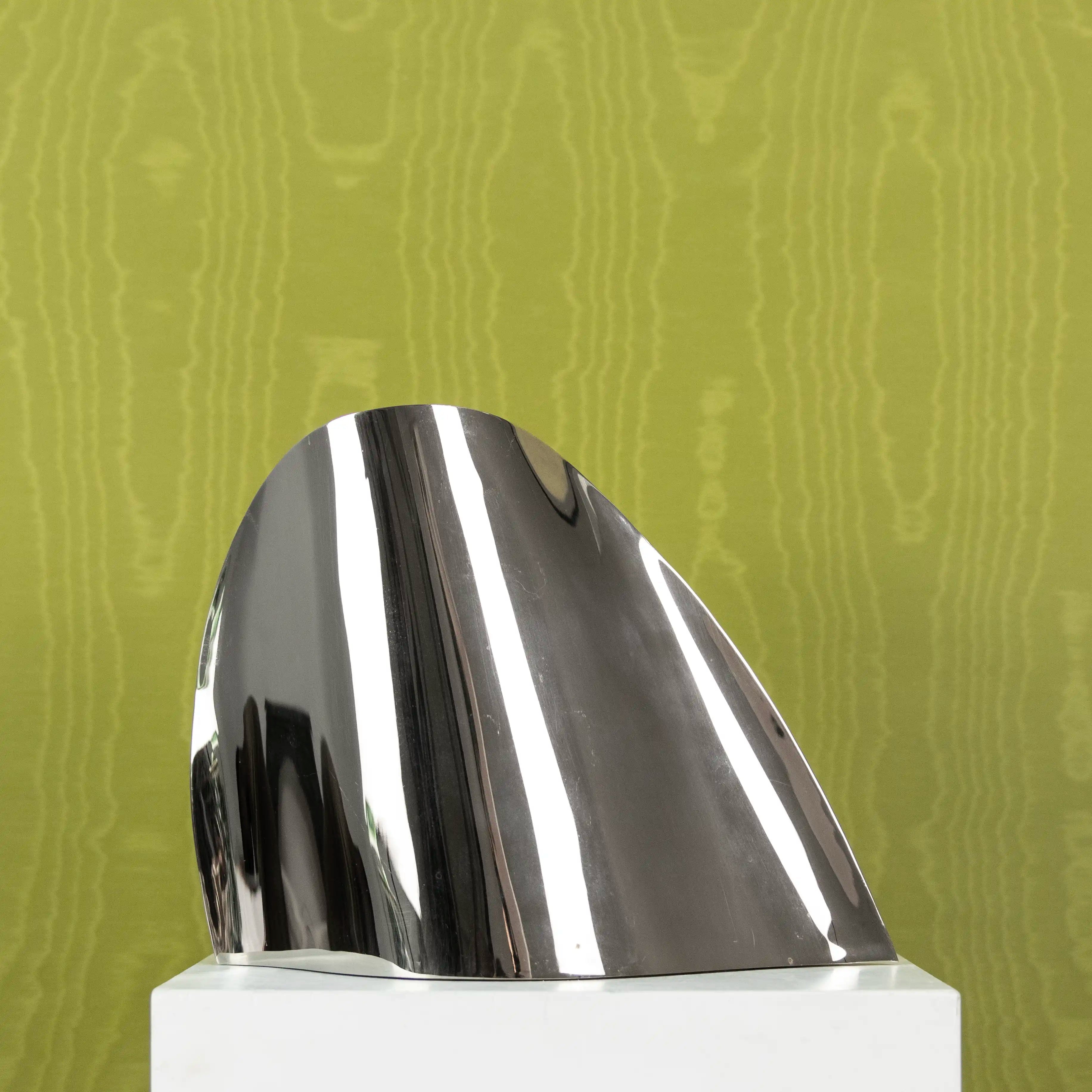 Vase sculptural en métal poli aux formes organiques et épurées. Sa surface miroir ultra-réfléchissante crée des jeux de lumière subtils, tandis que son design futuriste en fait une véritable pièce d'art fonctionnelle.